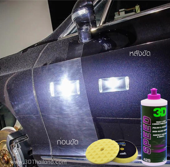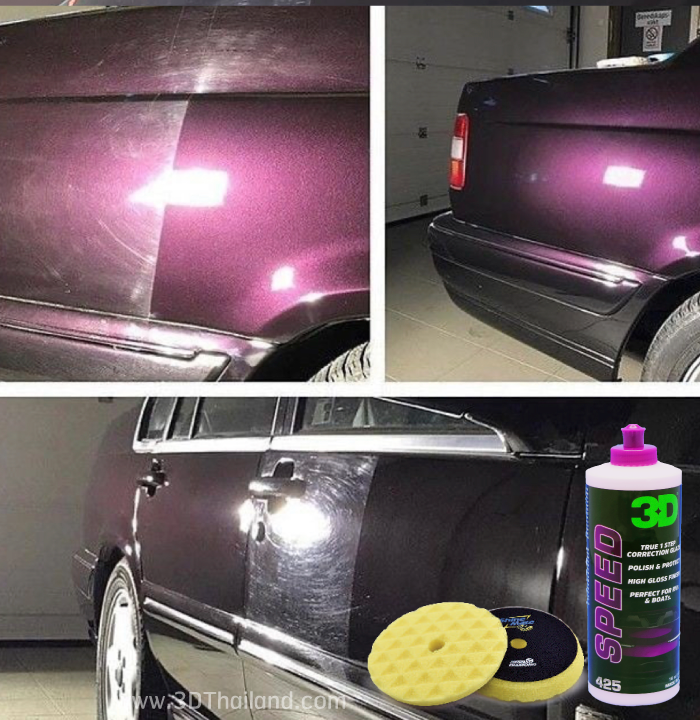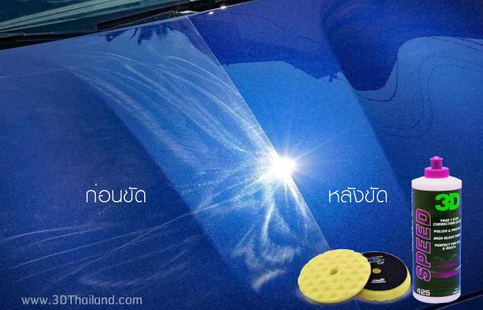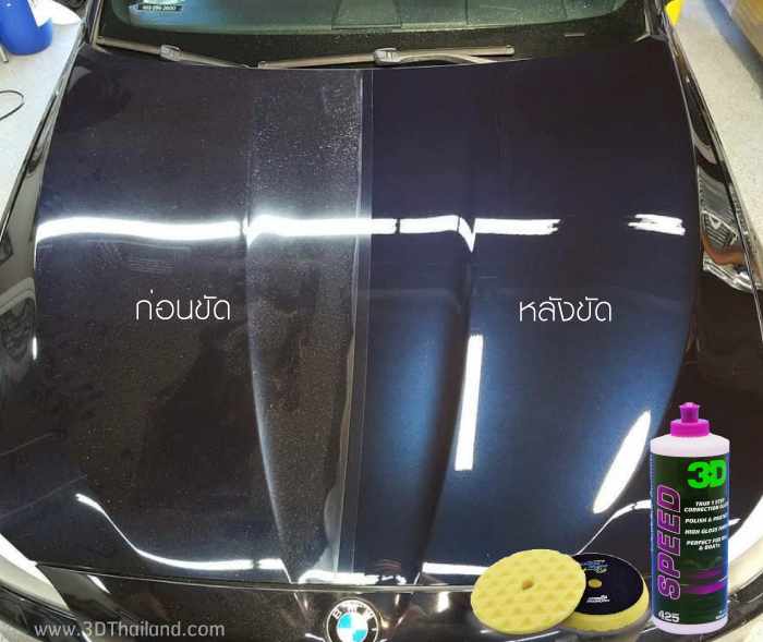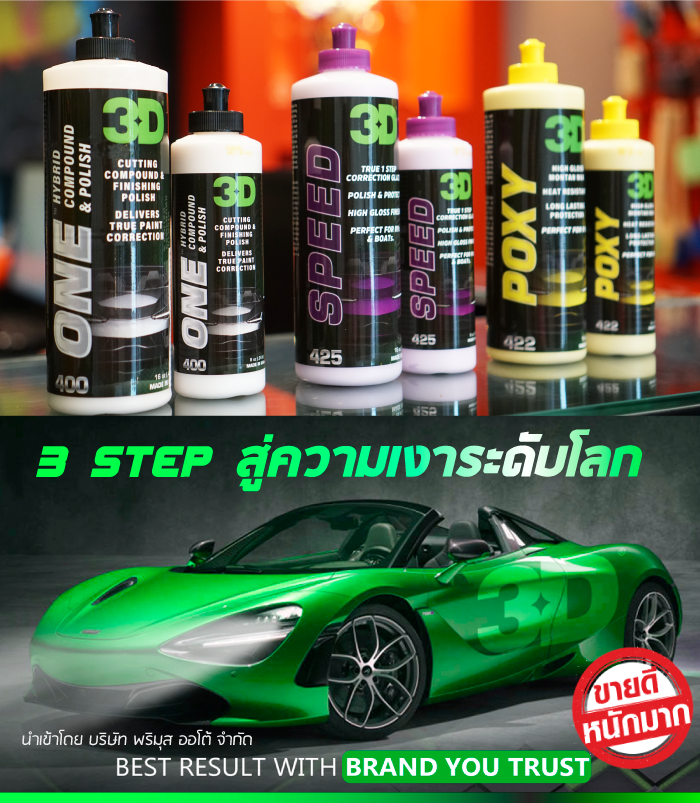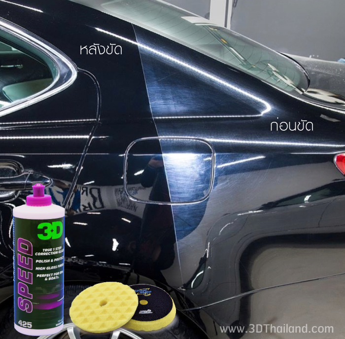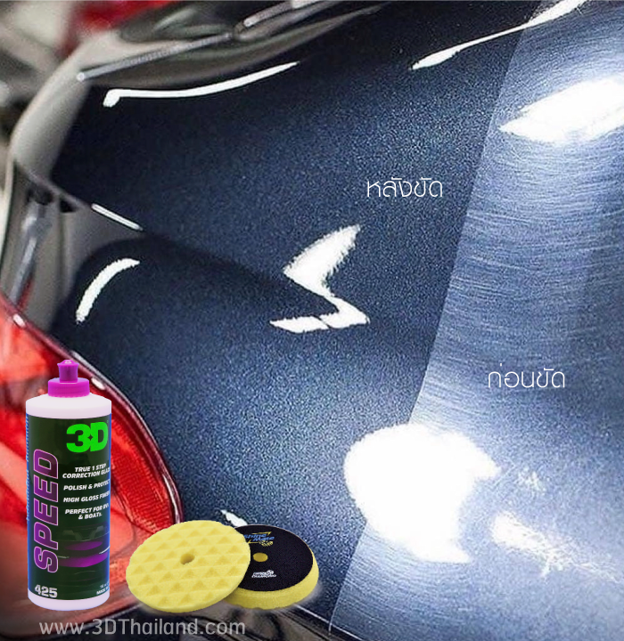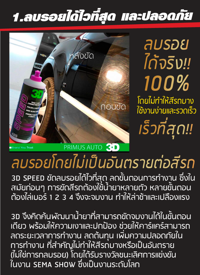 น้ำยาขัดเคลือบสีรถ 3D Speed ระบบปลอดเม็ดฝุ่น (Zero Dust) ไม่มีเม็ดฝุ่นหรือคราบแป้งเวลาขัด สามารถขัดลบรอยบางๆ ริ้วแสง Halogram ขจัดคราบไคล พร้อมให้ความเงางาม ฉ่ำ สวย (Deep Gloss) และปกป้องสีรถในขั้นตอนเดียว ใช้งานง่าย 1 Step Polish (Ultimate High Glass All-in-One Polish & Portect) สามารถขัดลบรอยขนแมว ริ้วแสง ระดับปานกลาง ให้ผิวสีรถเรียบเนียน เป็นประกาย ในขั้นตอนเดียว ให้สีรถกลับมาใหม่อีกครั้ง ใช้ได้กับรถทุกสี 3D Speed ปลอดภัยต่อสีรถ 100% ผลิตภัณฑ์ออกแบบมาให้ใช้งานง่ายพร้อมจุกเปิด-ปิด ใช้งานที่สะดวกสบาย ใหม่ล่าสุด!! 3D SPEED มาแรงสุดๆทั่วโลก อัฟเกรดจาก HD SPEED เป็นน้ำยาขัดปรับสภาพสีรถพร้อมเคลือบเงาในขั้นตอนเดียว (1-Step) ให้รถสวยระดับ Show Car พิสูจน์คุณภาพด้วยตัวคุณเองวันนี้กับเทคโนโลยี zero dust ไม่มีเม็ดฝุ่นมากวนใจ คุณสมบัติของ 3D SPEED อัฟเกรดจาก HD SPEED