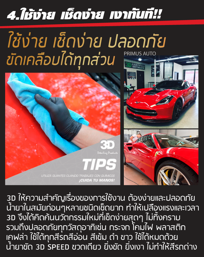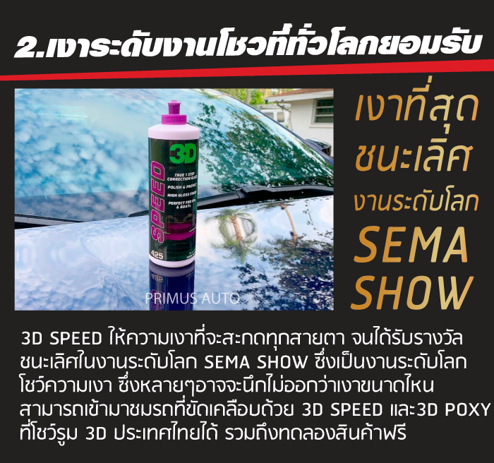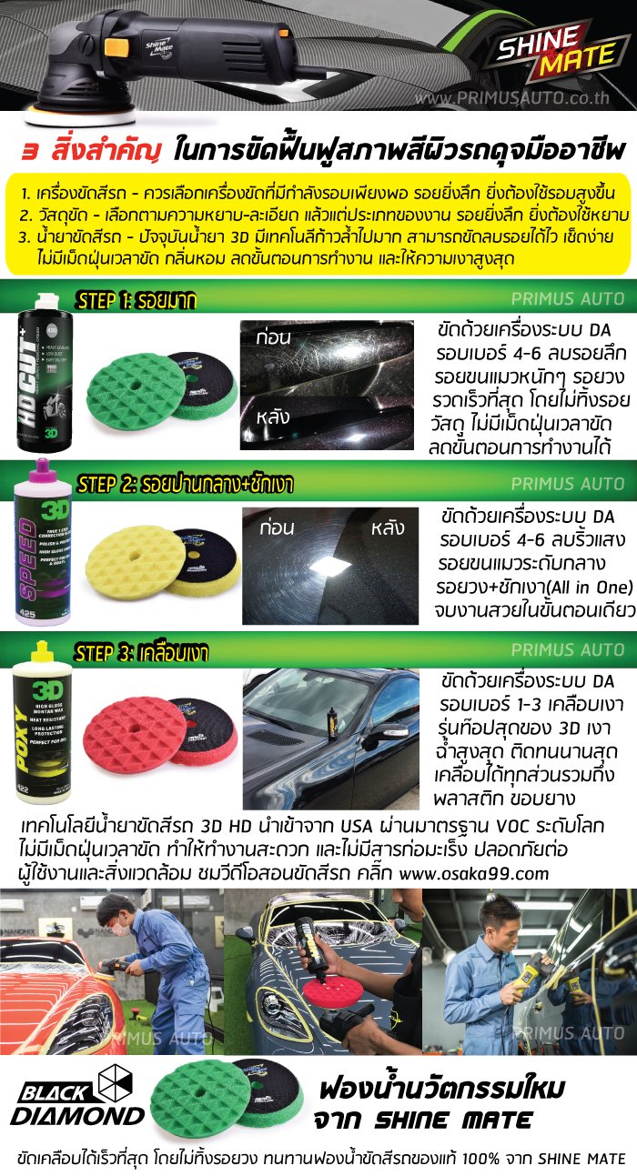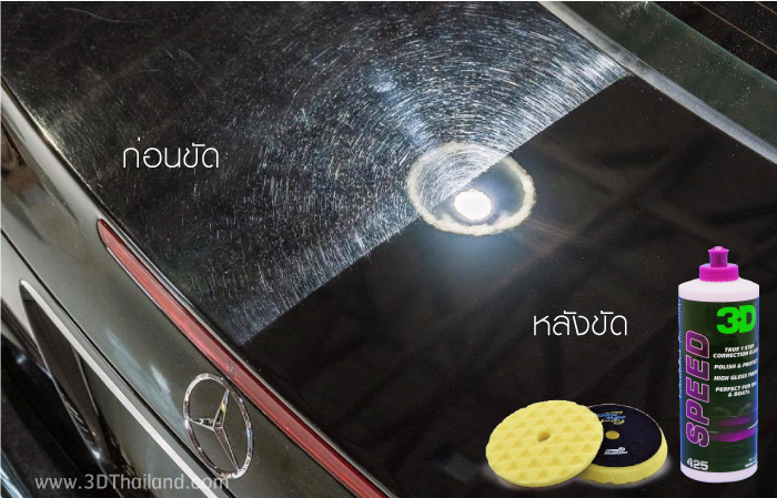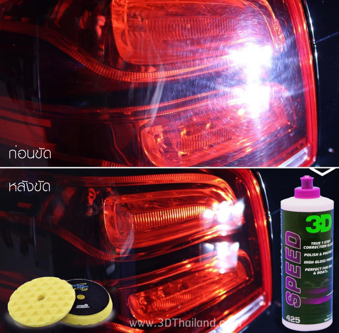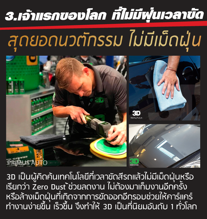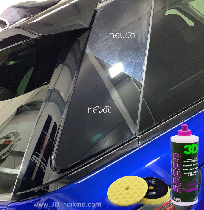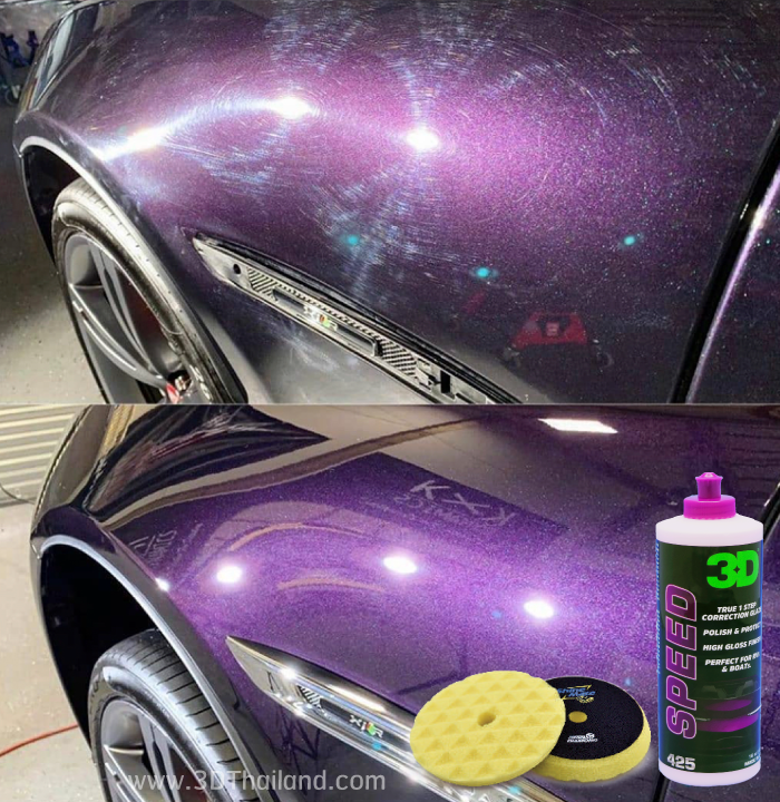 น้ำยาขัดเคลือบสีรถ 3D Speed ระบบปลอดเม็ดฝุ่น (Zero Dust) ไม่มีเม็ดฝุ่นหรือคราบแป้งเวลาขัด สามารถขัดลบรอยบางๆ ริ้วแสง Halogram ขจัดคราบไคล พร้อมให้ความเงางาม ฉ่ำ สวย (Deep Gloss) และปกป้องสีรถในขั้นตอนเดียว ใช้งานง่าย 1 Step Polish (Ultimate High Glass All-in-One Polish & Portect) สามารถขัดลบรอยขนแมว ริ้วแสง ระดับปานกลาง ให้ผิวสีรถเรียบเนียน เป็นประกาย ในขั้นตอนเดียว ให้สีรถกลับมาใหม่อีกครั้ง ใช้ได้กับรถทุกสี 3D Speed ปลอดภัยต่อสีรถ 100% ผลิตภัณฑ์ออกแบบมาให้ใช้งานง่ายพร้อมจุกเปิด-ปิด ใช้งานที่สะดวกสบาย ใหม่ล่าสุด!! 3D SPEED มาแรงสุดๆทั่วโลก อัฟเกรดจาก HD SPEED เป็นน้ำยาขัดปรับสภาพสีรถพร้อมเคลือบเงาในขั้นตอนเดียว (1-Step) ให้รถสวยระดับ Show Car พิสูจน์คุณภาพด้วยตัวคุณเองวันนี้กับเทคโนโลยี zero dust ไม่มีเม็ดฝุ่นมากวนใจ คุณสมบัติของ 3D SPEED อัฟเกรดจาก HD SPEED